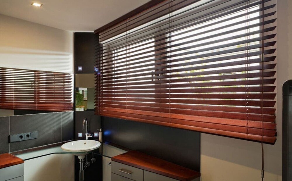 Коричневые деревянные жалюзи универсальны и подходят для большинства интерьеров (от классических до современных), привносят в пространство теплоту и натуральность.